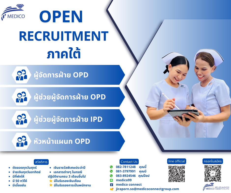 เปิดรับสมัคร( Full-time) ผู้จัดการฝ่าย OPD ผู้ช่วยผู้จัดการฝ่าย OPD ผู้ช่วยผู้จัดการฝ่าย IPD หัวหน้าแผนก OPD สามารถเริ่มงานได้ทันที สนใจติดต่อ ID : medico99 082-7811248 คุณบี้ 081-3797991 คุณบี 083-8924546 คุณป๊อป