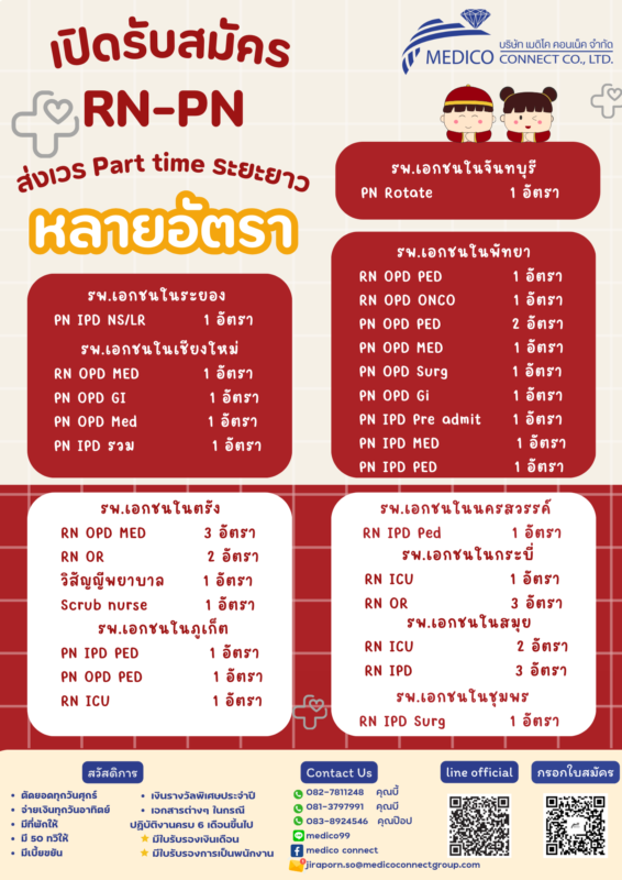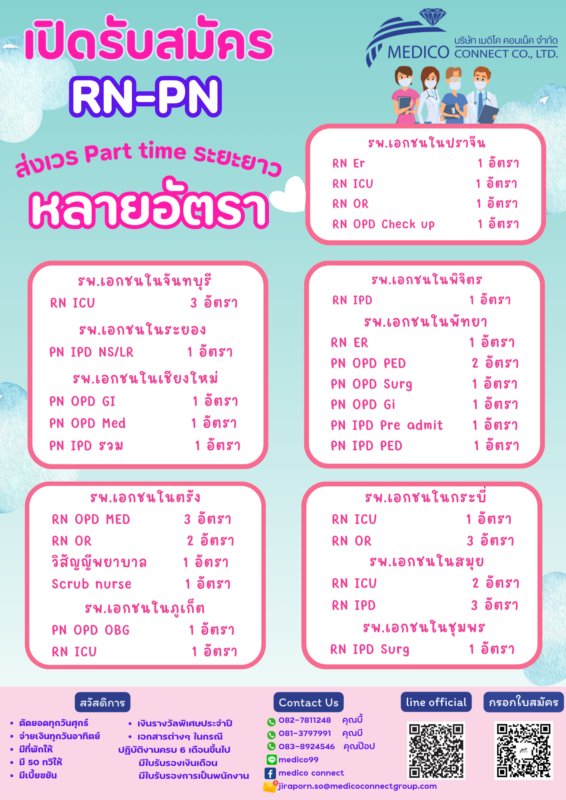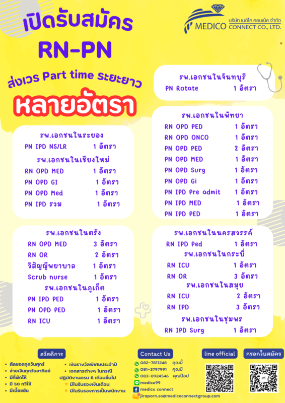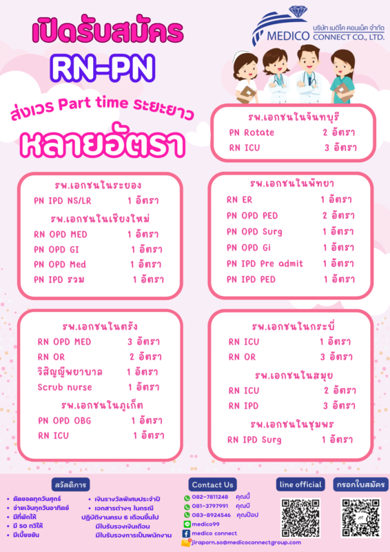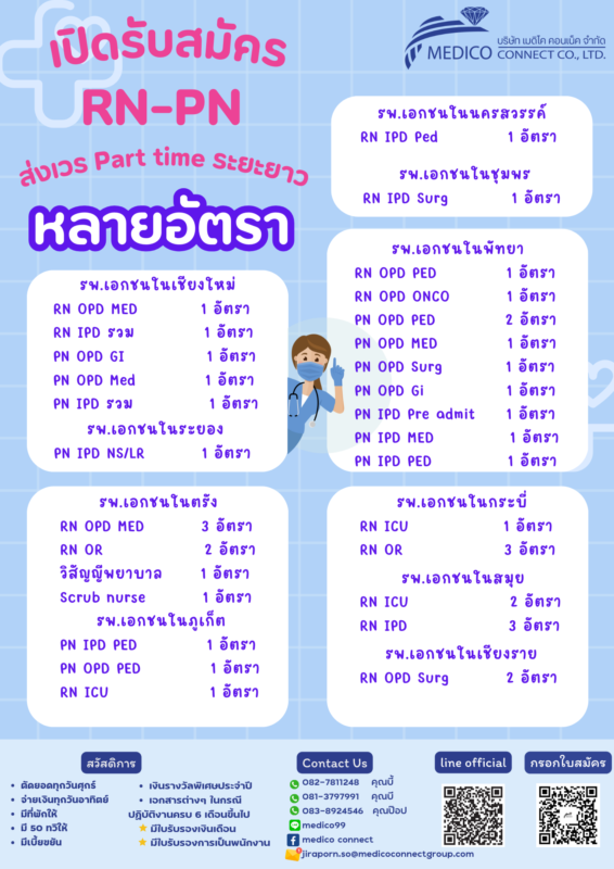 ประกาศ บริษัทเมดิโค คอนเน็ค เปิดรับสมัคร พยาบาลวิชาชีพ-ผู้ช่วยพยาบาล ( Part-time ส่งเวรยาวทั้งเดือน) หลายอัตรา สนใจติดต่อ ID : medico99 082-7811248 คุณบี้ 081-3797991 คุณบี 083-8924546 คุณป๊อป