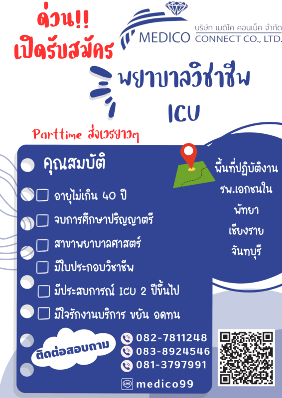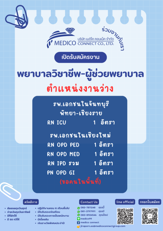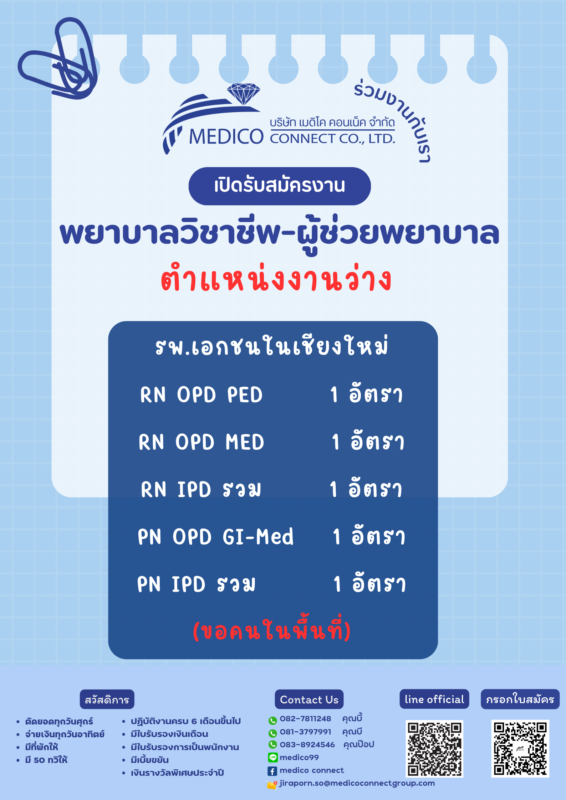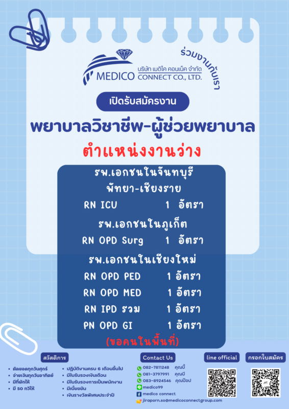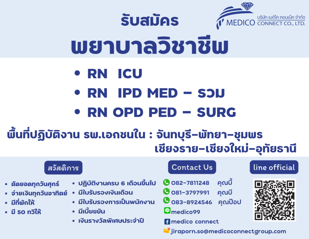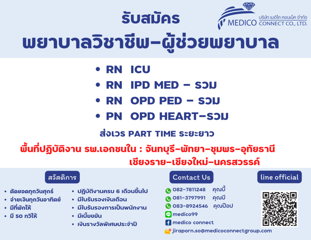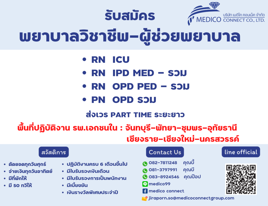 ไม่อยากให้คิดมาก แต่อยากให้คิดถึง มาเป็นครอบครัวเดียวกันนะค่ะ บริษัทเมดิโค คอนเน็ค เปิดรับสมัครพยาบาล-ผู้ช่วยพยาบาล (Part-time ส่งเวรยาวทั้งเดือน) หลายอัตรา สามารถเริ่มงานได้ทันที ดูแลทุกระดับประทับใจ งานดี เงินดี จ่ายตรงเวลา มีเบี้ยขยัน เงินรางวัลพิเศษประจำปี สนใจติดต่อ ID : medico99 082-7811248 คุณบี้ 081-3797991 คุณบี 083-8924546 คุณป๊อป