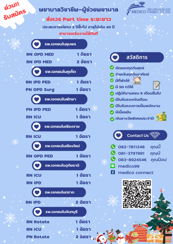 ของขวัญปีใหม่ ถึงไม่มีใคร แต่ขอให้มีเงิน 😍💎บริษัทเมดิโค คอนเน็ค💎 🩺เปิดรับสมัครพยาบาลวิชาชีพ-ผู้ช่วยพยาบาล( Part-time ส่งเวรยาวทั้งเดือน)🌻หลายอัตรา🌻🍀สามารถเริ่มงานได้ทันที🍀🎄ดูแลทุกระดับประทับใจ🎄🩺งานดี เงินดี จ่ายตรงเวลา มีเบี้ยขยัน เงินรางวัลพิเศษประจำปี💸สนใจติดต่อ ID : medico99082-7811248 คุณบี้081-3797991 คุณบี083-8924546 คุณป๊อป