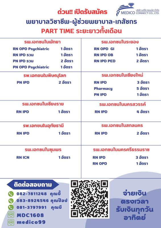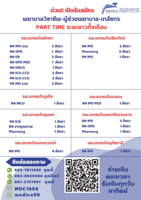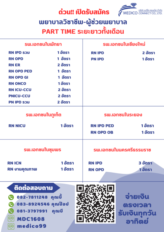 บริษัท เมดิโค คอนเน็ค จำกัด รับสมัครพยาบาล ผู้ช่วยพยาบาล ส่งเวร Part-time ปฏิบัติงาน : รพ.เอกชน พัทยา,นครสวรรค์,อุทัยธานี,เชียงราย,ภูเก็ต,พิษณุโลก มีที่พักให้ มี ประสบการณ์ 1-3 ปีขึ้นไป ส่งเวรยาวทั้งเดือน มี service mind active ตรงเวลา เงินออกทุกวันอาทิตย์ หัก 3% สนใจติดต่อ ID : medico99 ID : MDC1608 0827811248 0838924546 0813797991 (email)e-mail : Jiraporn.so@medicoconnectgroup.com