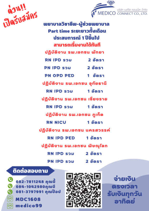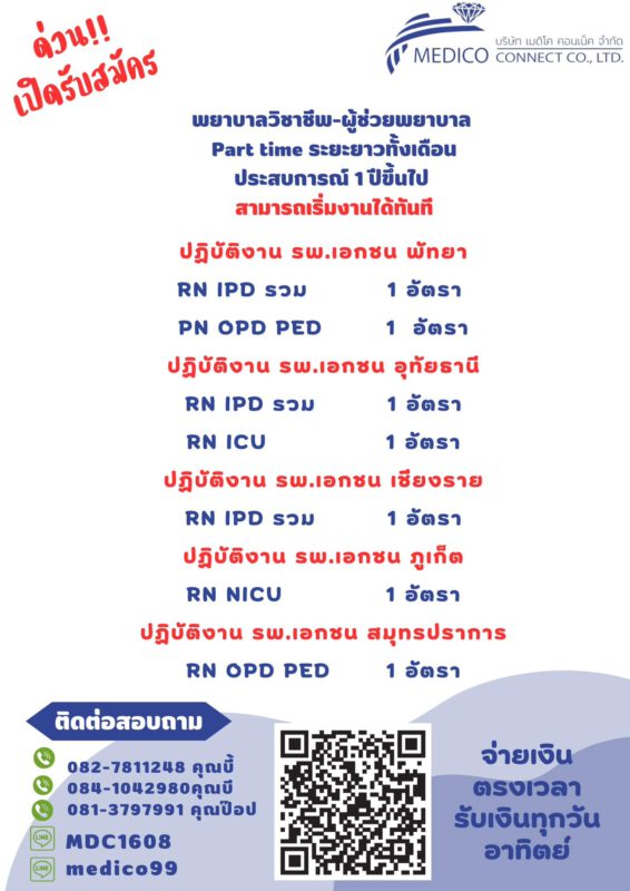 Up date 14/09/2023💎บริษัท เมดิโค คอนเน็ค จำกัด💎🚨รับสมัครพยาบาล ผู้ช่วยพยาบาล 🚨☀️ส่งเวร Part-timeปฏิบัติงาน : รพ.เอกชน พัทยา,นครสวรรค์,อุทัยธานี,เชียงราย,ภูเก็ต🏠มีที่พักให้🌻มี ประสบการณ์ 1-3 ปีขึ้นไป♻️ส่งเวรยาวทั้งเดือน💜 มี service mind💜active ตรงเวลา💸 เงินออกทุกวันอาทิตย์ หัก 3%📱สนใจติดต่อID : medico99ID : MDC1608📞0827811248📞0838924546📞0813797991(email)e-mail : Jiraporn.so@medicoconnectgroup.com