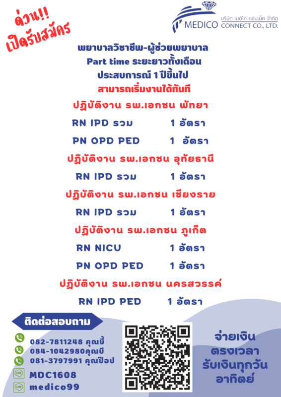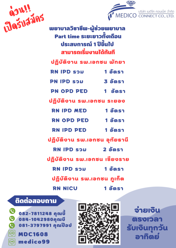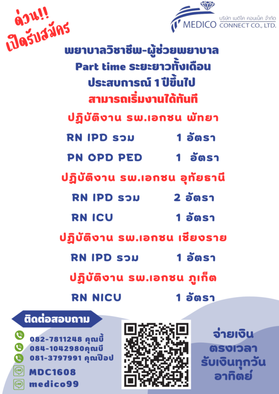 บริษัท เมดิโค คอนเน็ค จำกัด รับสมัครพยาบาล ผู้ช่วยพยาบาล ส่งเวร Part-time ปฏิบัติงาน : รพ.เอกชน พัทยา,อุทัยธานี,เชียงราย,ภูเก็ต มีที่พักให้ มี ประสบการณ์ 1-3 ปีขึ้นไป ส่งเวรยาวทั้งเดือน มี service mind active ตรงเวลา เงินออกทุกวันอาทิตย์ หัก 3% สนใจติดต่อ ID : medico99 ID : MDC1608 0827811248 0841042980 0813797991 (email)e-mail : Jiraporn.so@medicoconnectgroup.com