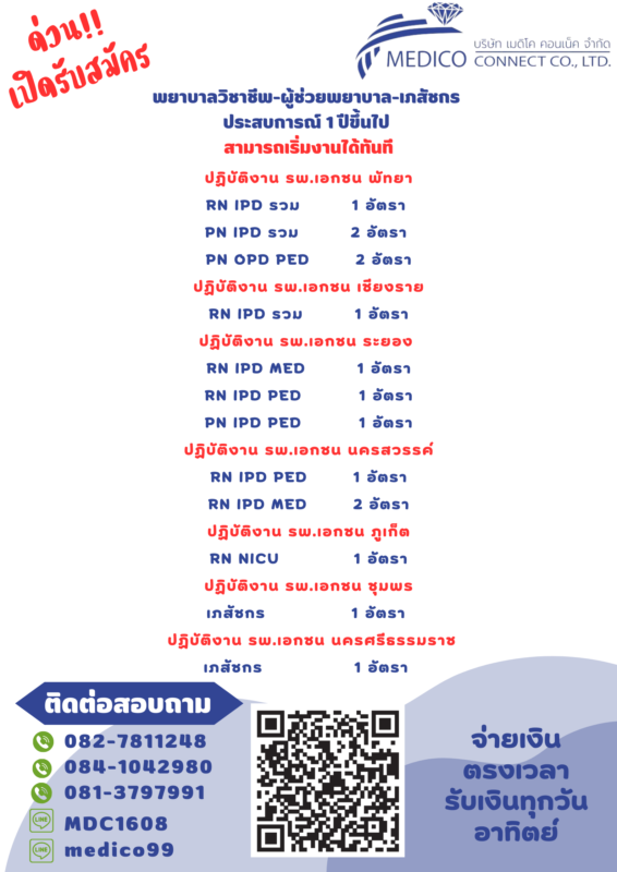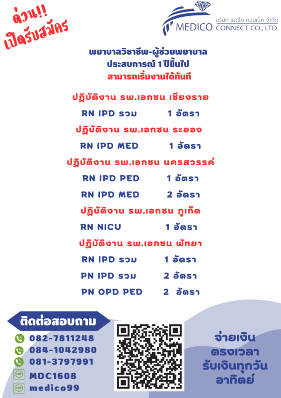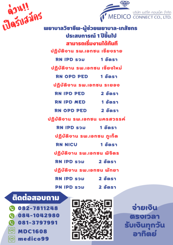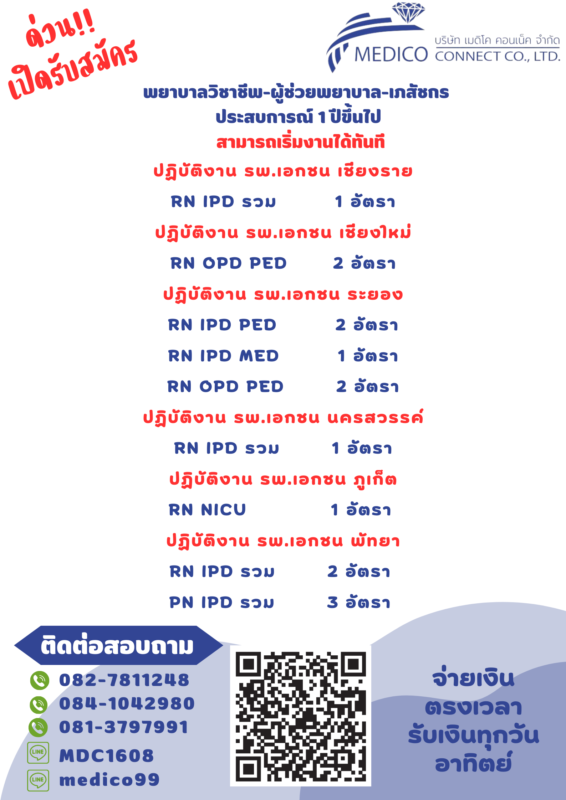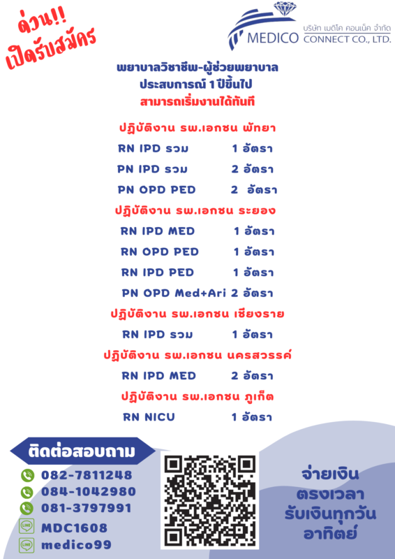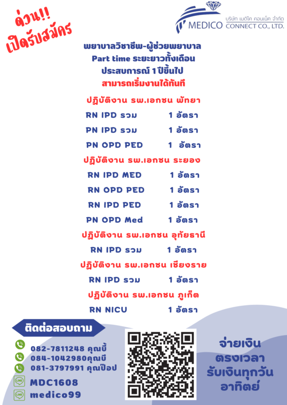 รับสมัครพยาบาล ผู้ช่วยพยาบาล ส่งเวร Part-time ปฏิบัติงาน : รพ.เอกชน เชียงใหม่,เชียงราย,ระยอง,พัทยา,นครสวรรค์ มีที่พักให้ มี ประสบการณ์ 1-3 ปีขึ้นไป ส่งเวรยาวทั้งเดือน มี service mind active ตรงเวลา เงินออกทุกวันอาทิตย์ หัก 3% สนใจติดต่อ ID : medico99 ID : MDC1608 0827811248 0841042980 0813797991 (email)e-mail : Jiraporn.so@medicoconnectgroup.com