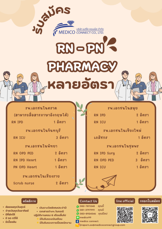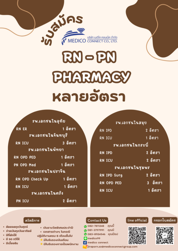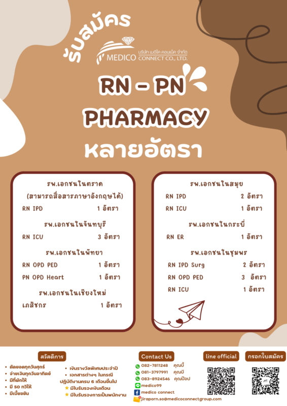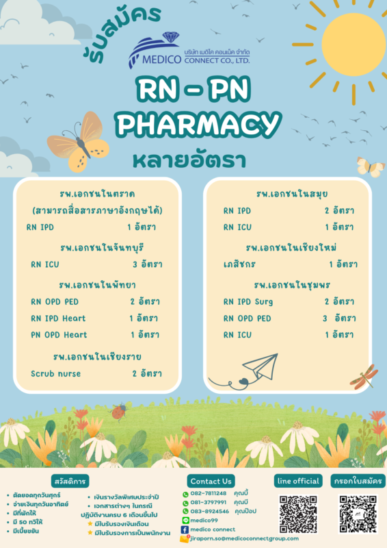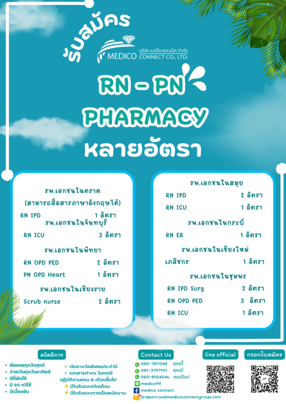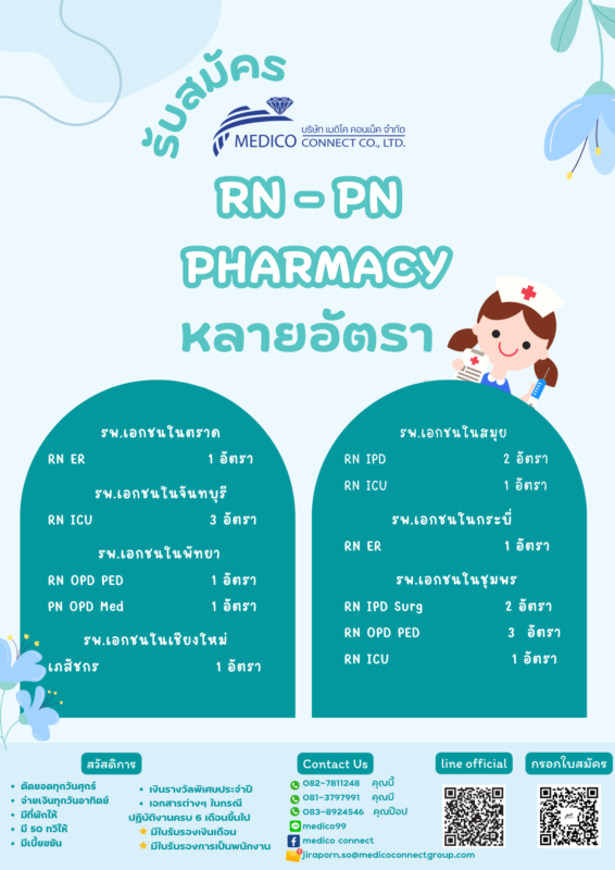 จะมีนา หรือมีไหน เราก็มีใจให้ตลอดนะ บริษัทเมดิโค คอนเน็ค จำกัด เปิดรับสมัคร พยาบาลวิชาชีพ-ผู้ช่วยพยาบาล-เภสัชกร Part-time ส่งเวรยาวทั้งเดือน สามารถเริ่มงานได้ทันที สนใจติดต่อ : medico99 082-7811248 คุณบี้ 081-3797991 คุณบี 083-8924546 คุณป๊อป e-mail : Jiraporn.so@medicoconnectgroup.com