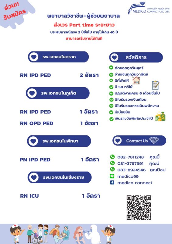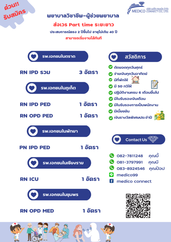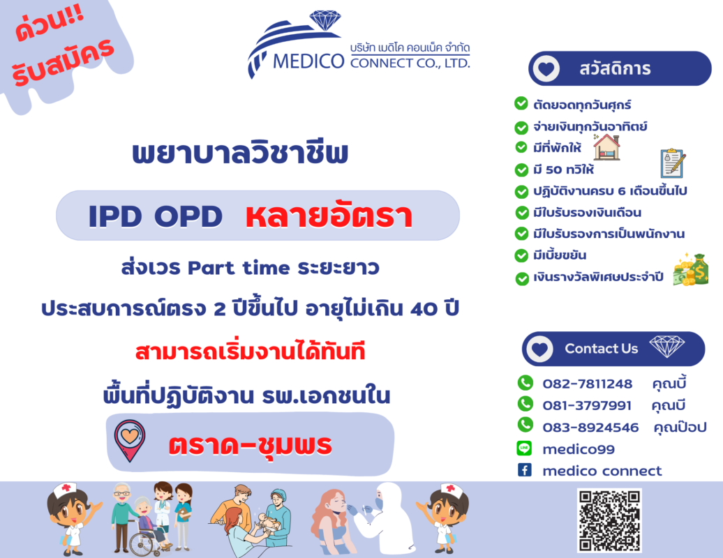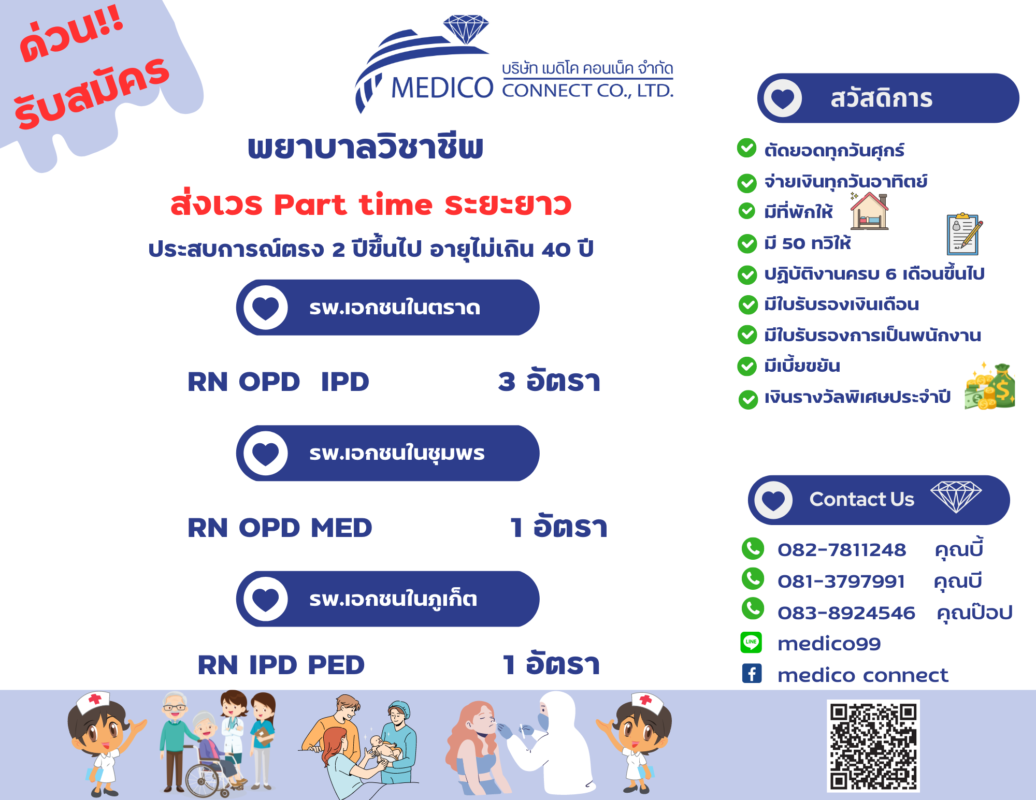 ด่วน!! บริษัทเมดิโค คอนเน็ค จำกัด เปิดรับสมัคร พยาบาลวิชาชีพ-ผู้ช่วยพยาบาล ( Part-time ส่งเวรยาวทั้งเดือน) สามารถเริ่มงานได้ทันที สนใจติดต่อ ID : medico99 082-7811248 คุณบี้ 081-3797991 คุณบี 083-8924546 คุณป๊อป e-mail : Jiraporn.so@medicoconnectgroup.com