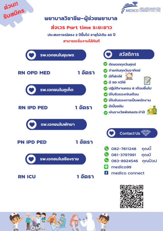 ตามหาเพื่อนร่วมงาน บริษัทเมดิโค คอนเน็ค เปิดรับสมัครผู้ช่วยพยาบาล หลายอัตรา ( Part-time ส่งเวรยาวทั้งเดือน) ดูแลทุกระดับประทับใจ งานดี เงินดี จ่ายตรงเวลา มีเบี้ยขยัน เงินรางวัลพิเศษประจำปี สนใจติดต่อ ID : medico99 082-7811248 คุณบี้ 081-3797991 คุณบี 083-8924546 คุณป๊อป e-mail : Jiraporn.so@medicoconnectgroup.com