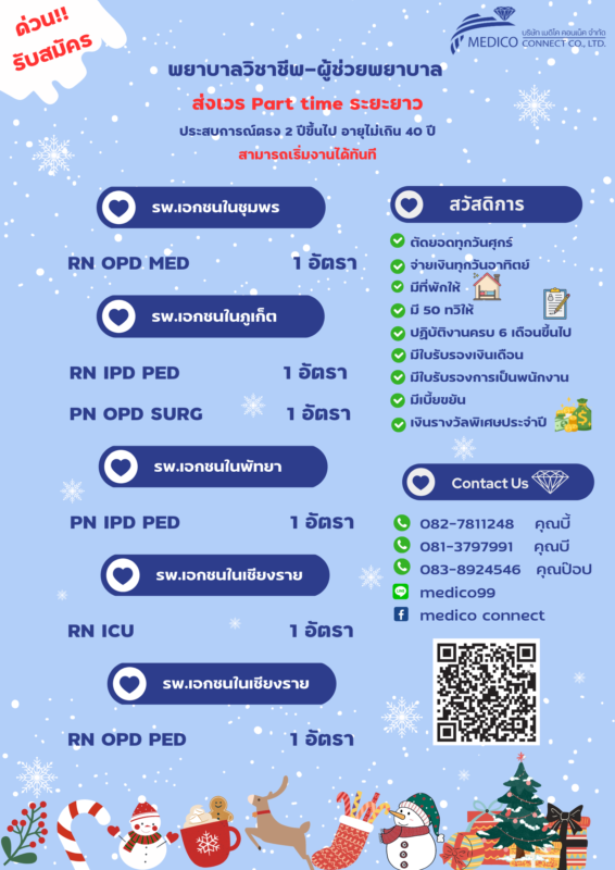 กวางเรนเดียร์อะมีเขา แต่ในใจเราอะมีแต่เธอ มาเป็นครอบครัวเดียวกันนะค่ะ บริษัทเมดิโค คอนเน็ค เปิดรับสมัครพยาบาลวิชาชีพ ( Part-time ส่งเวรยาวทั้งเดือน) หลายอัตรา สามารถเริ่มงานได้ทันที ดูแลทุกระดับประทับใจ งานดี เงินดี จ่ายตรงเวลา มีเบี้ยขยัน เงินรางวัลพิเศษประจำปี สนใจติดต่อ ID : medico99 082-7811248 คุณบี้ 081-3797991 คุณบี 083-8924546 คุณป๊อป